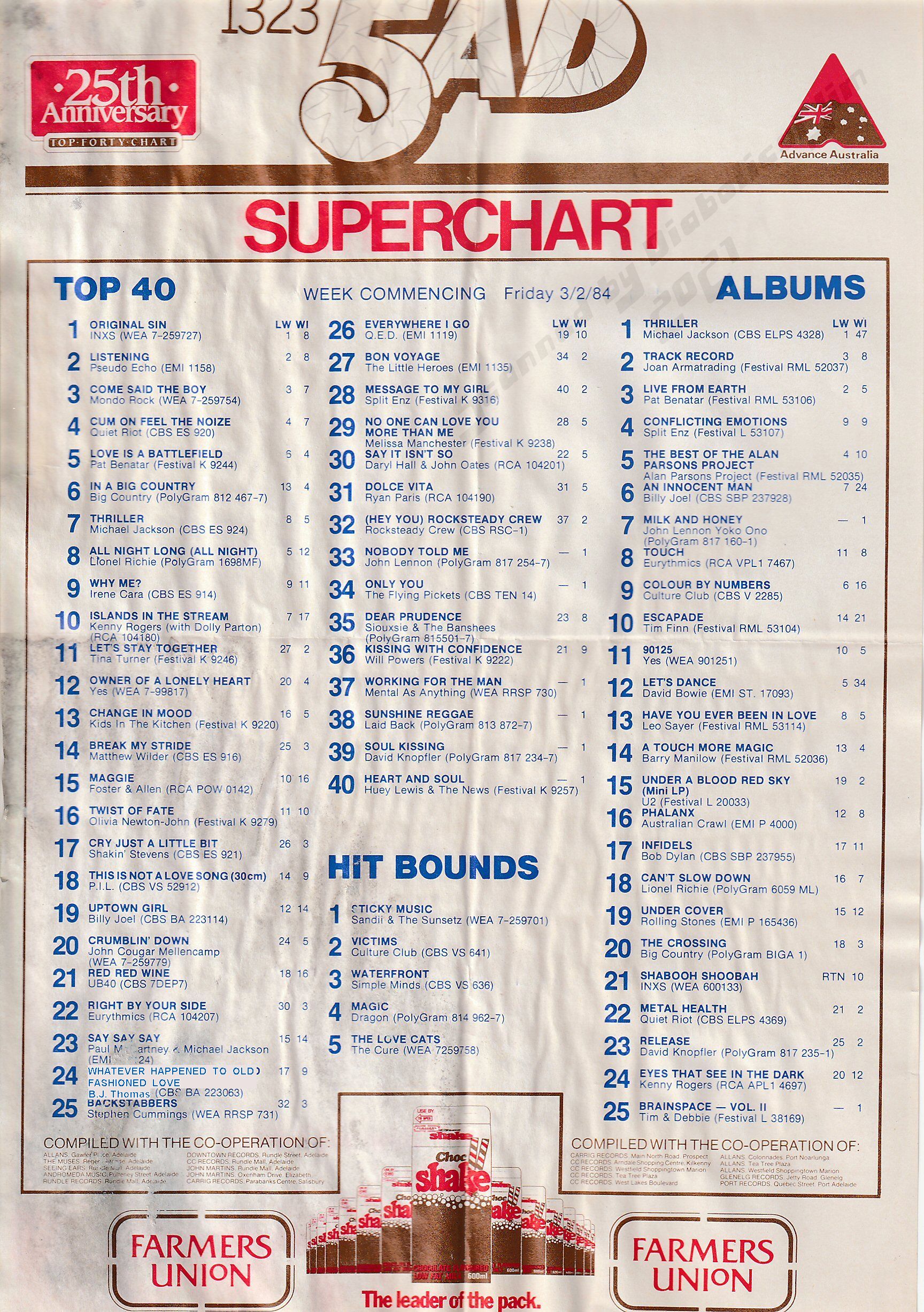 This would’ve been a real meh! chart for me back then. About the only two songs I would’ve liked were In A Big Country by Big Country—still one of my all time favourite bands, who’s albums I still play regularly—and This is Not a Love Song by P.I.L. (I still like this and a lot of their music, even though I stopped liking Lydon way back in the late 80s. Back then it was because he told Richard Wilkins that Nelson Mandela was “nothing but a terrorist” when asked about the Free Nelson Mandela movement but nowadays it’s because he’s nothing but a fat, whiny, right-wing cunt). Even the Siouxsie & the Banshees cover of a Beatles song leaves me a bit cold because back then it felt like a total sell-out by the band.